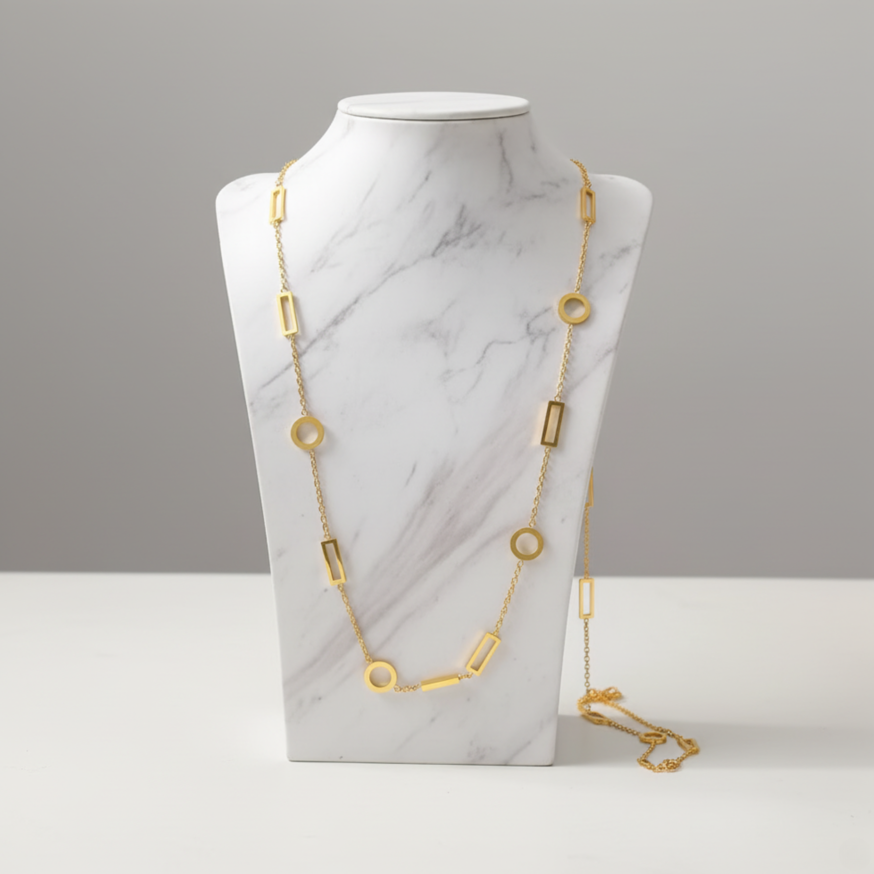Collier en acier inoxydable doré, orné d’alternances de maillons ronds et rectangulaires au design géométrique raffiné.